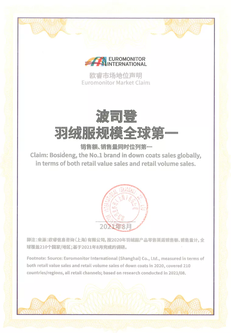 今年8月,全球市場調查機構歐睿國際(Euromonitor)完成了2020年羽絨服產品零售渠道銷售額、銷售量統計,結果顯示,波司登羽絨服規模全球第一,銷售額、銷售量同時位列第一,這意味著波司登已躋身全球羽絨服市場第一梯隊。