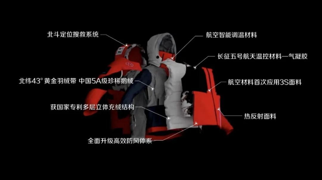 在材料創新方面,波司登還聯合中國航空工業文化中心共同研發了兼具防風、防水、耐磨、抗撕裂、抗菌等功能的3S面料,提升了“登峰2.0”系列在極端惡劣天氣和復雜地理環境中的適應性。此外,波司登還將長征五號同類航天納米保溫材料——氣凝膠應用于登峰2.0系列的電子儀器保護袋處,以保護電子設備免受極端低溫影響。