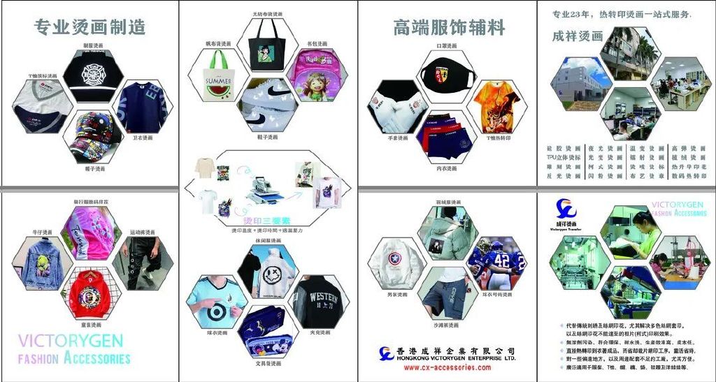 成祥企業專業燙畫23年,提供熱轉印燙畫一站式服務,主營產品包括:立體硅膠燙標、水性厚版燙標、TPU立體燙標、柯式燙畫、反光燙畫、高彈燙畫、防水布燙畫、燙嘜燙標、閃粉燙畫、植絨燙畫、夜光燙畫、鐳射燙畫、布藝燙章、雕刻燙畫、防升華燙畫、硅膠燙章、植絨燙章、溫變燙畫、光變燙畫等。
