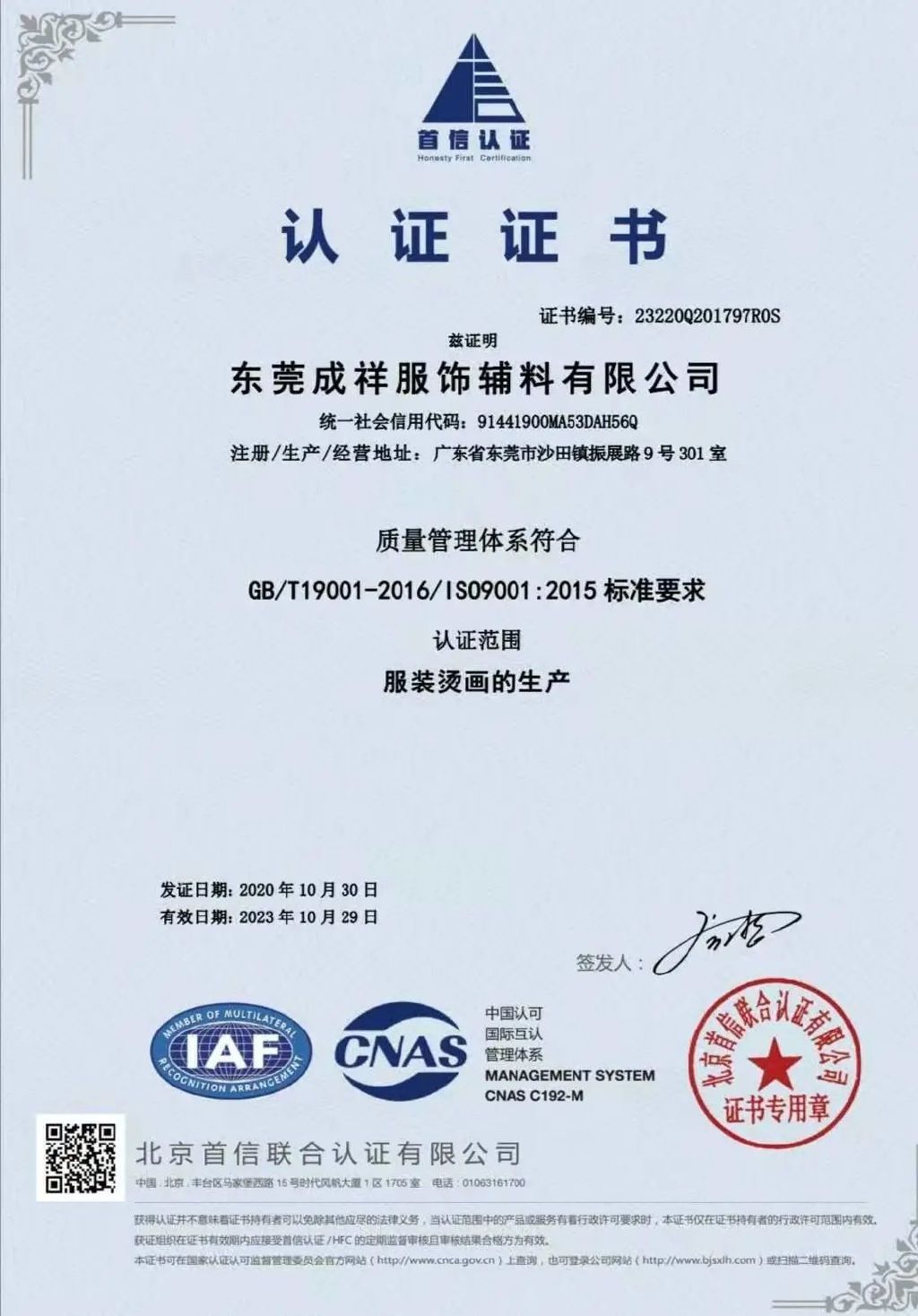 成祥企業的服裝燙畫產業獲得了了ISO9001、OEKO-TEX STANDARD 100、SMETA SEDEX等權威資質認證